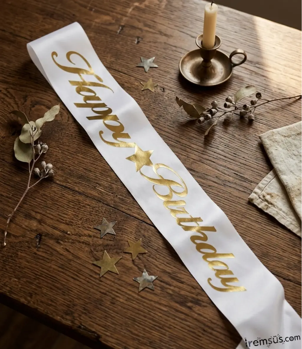 Saten kumaş üstüne Happy Birthday yazılıdır.