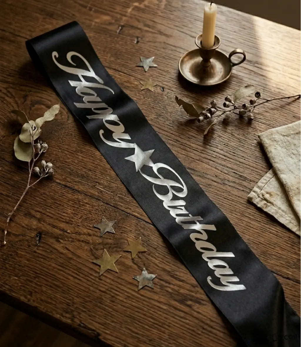 Happy Birthday Yazılı Gümüş Yaldızlı Siyah Kuşak 150 Cm Doğum Günü Kuşağı Süslemesi